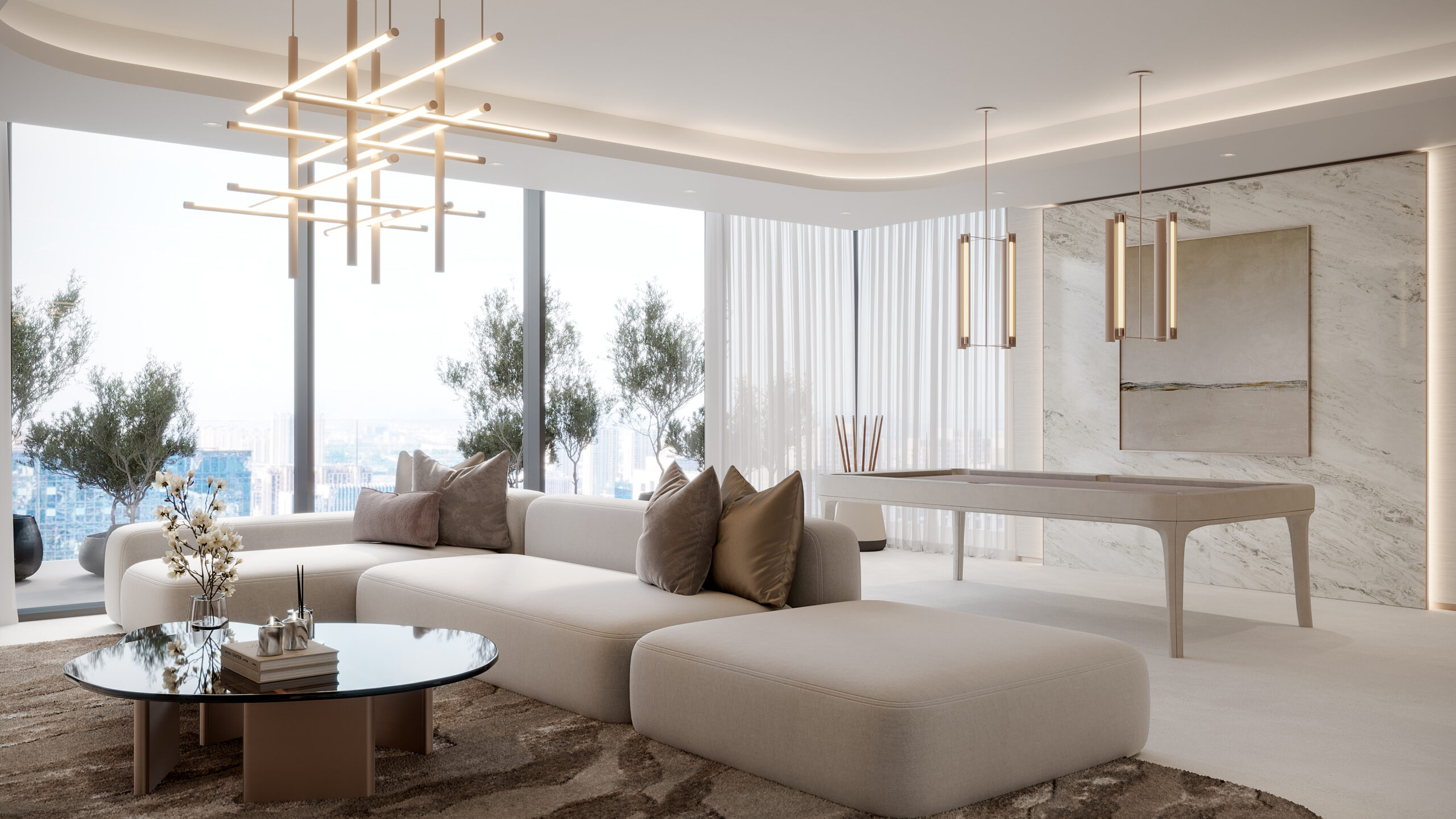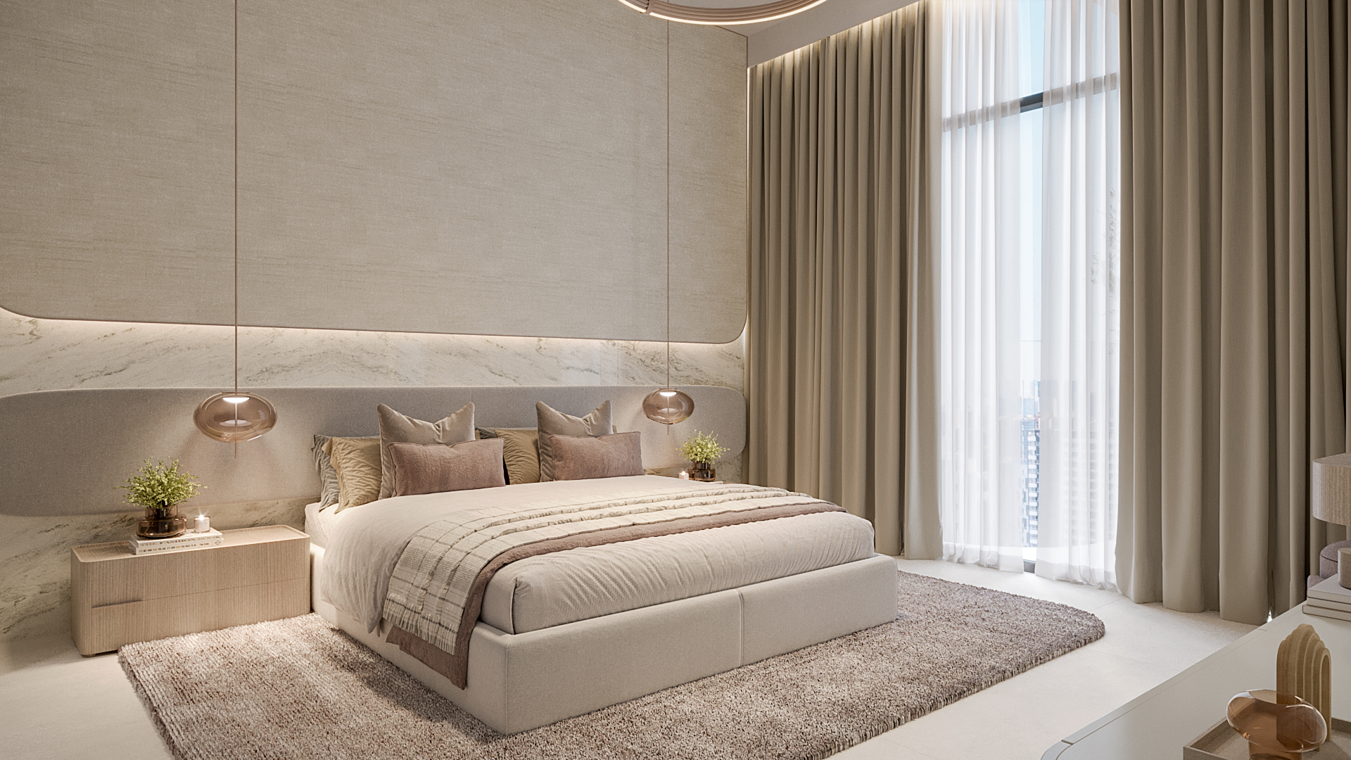Each residence is crafted with calming tones of ivory, sand, and soft greys, paired with natural stone, wood, and tactile fabrics. The result is a timeless aesthetic that feels serene yet sophisticated.